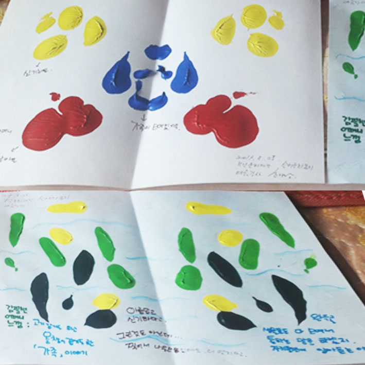 수채화물감으로 원하는 색을 선택하여 쿡쿡 듬뿍 종이에 짜낸 후 찍고 누르고 펼쳐보면 다양하고 화려한 무늬들이 이야기를 쏟아냅니다. 이 물감놀이를 통해 오늘은 무슨 이야기보따리가 풀릴까요. 물감을 다루는 시간에는 더 많은 추억의 이야기를 들을 수 있었습니다. 자식들 이야기, 가족 이야기가 가장 많은 듯합니다. 어르신의 아픔보다는 여전히 가족을 생각하고 자식을 생각하는 마음뿐인데 그 자식은 어디 있는 걸까요. 위의 그림에서 빨간색과 노란색, 파란색으로 물감 찍기 한 것은 가족에 대한 그리움이 컸습니다. 가족들이 보여 살았던 젊은 날의 추억을 많이 생각하였고 그리워하셨지요. 노란색은 신기한 무엇이라고 하시며 세상사는 것 그 자체가 신기한 일이라고 하시며 웃으셨습니다. 입술이 부르트셔서 웃는 것조차 힘드셨지만 웃으셨습니다. 어린 시절들과 수녀원에서 살다가 나온 이야기들 장사했던 일들 그 모든 것들이 아픔이었지만 지금은 다시 못 올 추억으로 남았다며 그림을 쓰다듬으셨던 모습을 저도 지금 추억하고 있습니다. 이렇게 완성된 그림들을 스크랩하여 정성껏 모아 두셨던 그림으로 남긴 마음의 편지들은 잘 도착했을까요. 저와의 인연은 7번으로 마쳐야 했으므로 그 이후의 일을 알 수가 없으나 그때의 화분 꽃 추억을 그린 그림 편지는 원하셨던 분에게 잘 도착하여 서로에게 위로를 주고 또 하나의 추억으로 남아 힐링의 시간이 되어 주지 않을까 생각해 봅니다.