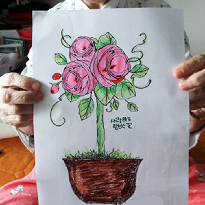 오늘은 화분에 핀 꽃을 그리며 글을 쓰는 시간을 마련하였습니다. 또한 물감을 이용해서 찍고 누르는 등 물감 놀이를 하기로 했습니다. 중간중간 몸이 너무 아파하시어 쉬시길 권하였으나 진통제를 먹으며 견디시는 모습은 아직도 잊을 수가 없습니다. 손쉽게 접할 수 있는 사인펜과 물감을 이용해서 그림을 그렸는데 참으로 기뻐하셔서 저 또한 기쁜 시간이었습니다. 이렇게 그림을 그린 후 어르신은 추억의 이야기보따리를 풀어내시곤 하였는데 저는 빠른 속도로 받아 적어 드렸습니다. 그렇게 적은 글들 중 어르신이 오케이 한 것들을 추려서 다시 옮겨 적어드렸지요. 이러한 과정을 거쳐서 어르신의 그림 꽃 일기는 한 장 한장 쌓여 갔고 이것을 모드 잘 보관하고 있었습니다. 그리고 늘 말씀하셨지요. 멀리 있는 자식에게 전해주고 싶다고요. 이렇게 그림을 그리고 글을 쓰는 과정을 통해서 추억의 이야기들이 쏟아져 나왔고 그림움들이 묻어 나왔으며 살아오면서 체험하고 느꼈던 것들이 표현되었습니다. 이런 과정을 통해서 마음이 후련하다고도 하셨는데 그림을 그린다는 것이 그 자체로 끝나는 것이 아니라 사람의 마음을 정화시키는 힘이 된다니 이것이 바로 힐링의 예술이 아닌가 생각해 봅니다. 물론 우리의 주변에는 우리의 삶에 변화를 주고 행복을 줄 수 있는 것들이 많이 있습니다. 그런데 그 무엇에서 그런 것을 찾을 수 있는가의 문제인 것 같습니다.