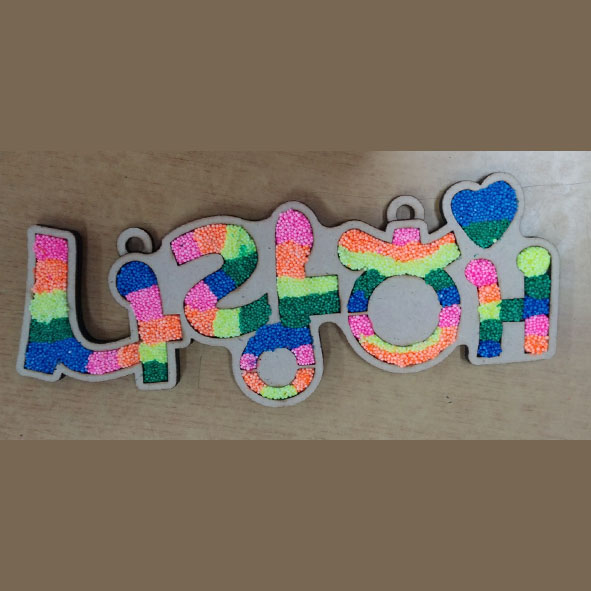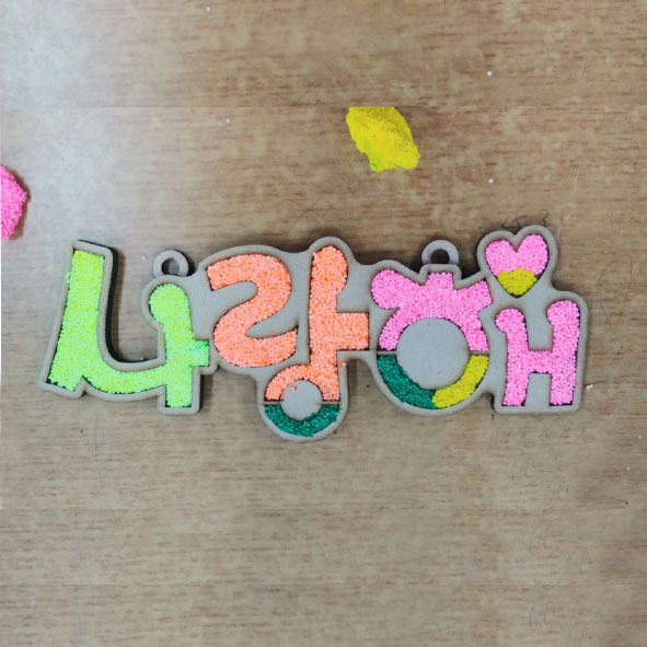 위의 사진에서 이 어린이는 무지개 빛 이미지로 사랑해 글씨를 완성했어요. 이렇게 완성된 글씨 원목에 끈을 달아서 마무리해 주었습니다. 끈은 여러 가지 색들을 준비해 놓고 선택할 수 있도록 했어요. 스스로 완성한 작품을 소중하게 다루는 아이들의 모습을 보니 저의 마음도 흐뭇했습니다. 오늘은 어린이들의 폼클레이 만들기 작품들을 소개해 보았습니다.