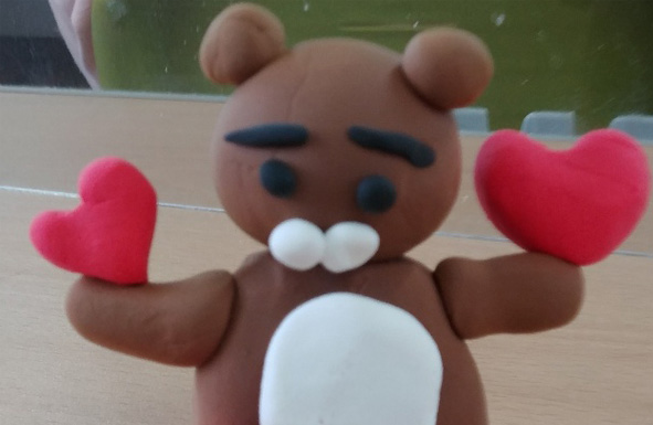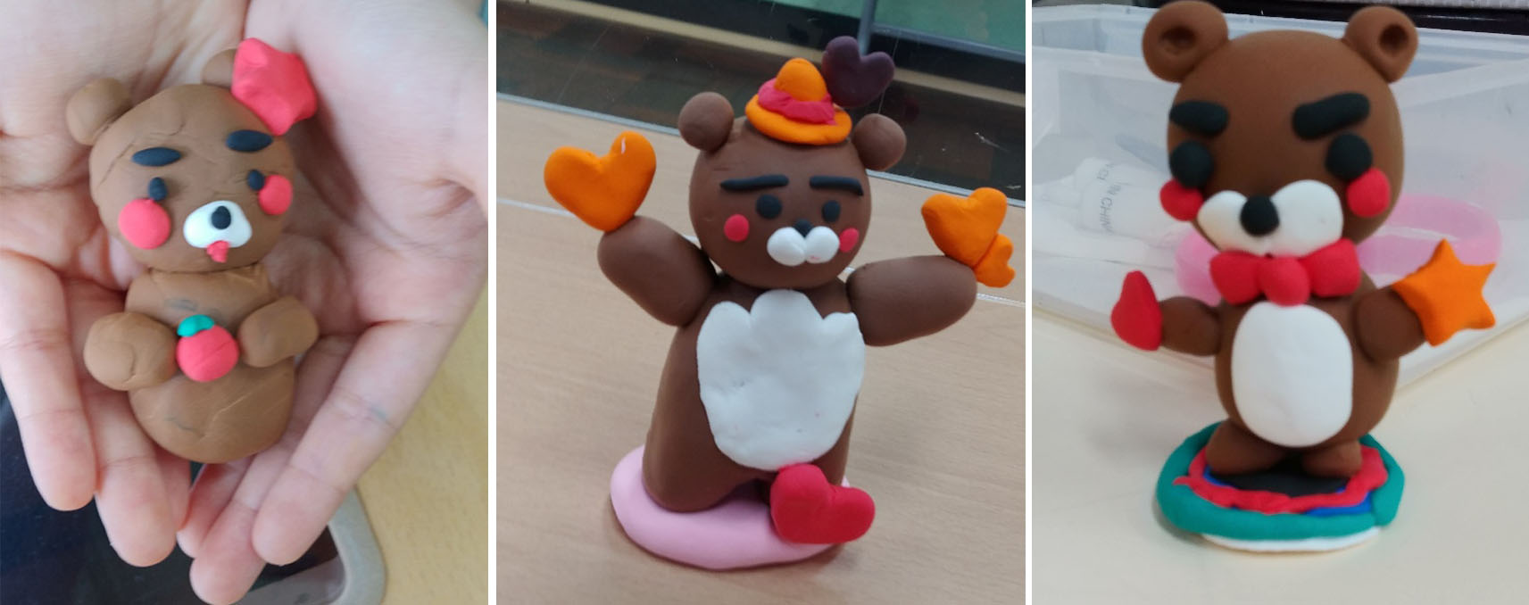 위의 사진은 2학년 어린이가 만든 칼라클레이 작업으로 카카오 라이언을 만든 캐릭터입니다. 라이언 가족이라고 했어요. 누워있는 큰 라이언은 엄마이고 위에는 자기이고 아래는 동생 라이언이라고 합니다. 엄마 라이언 배 위에 올려있는 하트가 인상적인 것 같아요.