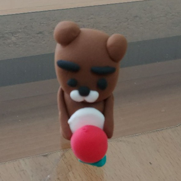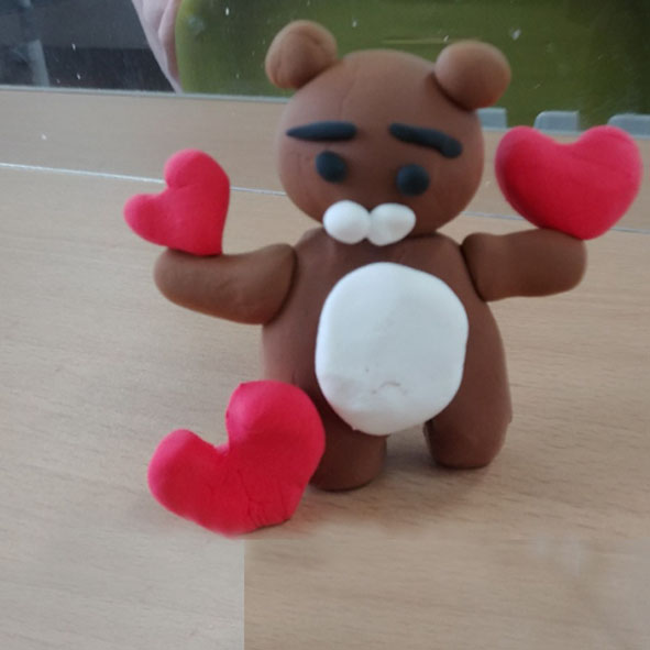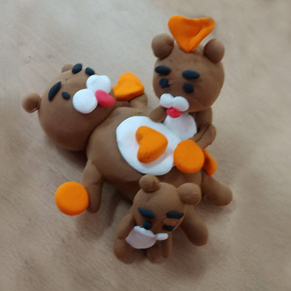 엄마 라이언과 자신은 무언가 이야기를 하고 있고 동생은 등을 돌리고 앉아 있는 모습을 만들었어요. 이 어린이는 상상력과 표현력이 뛰어난 것을 알 수 있어요. 그리고 이 칼라클레이 수업을 1년 정도 하였으므로 클레이 작업을 자신 있게 잘 수행하는 어린이입니다.