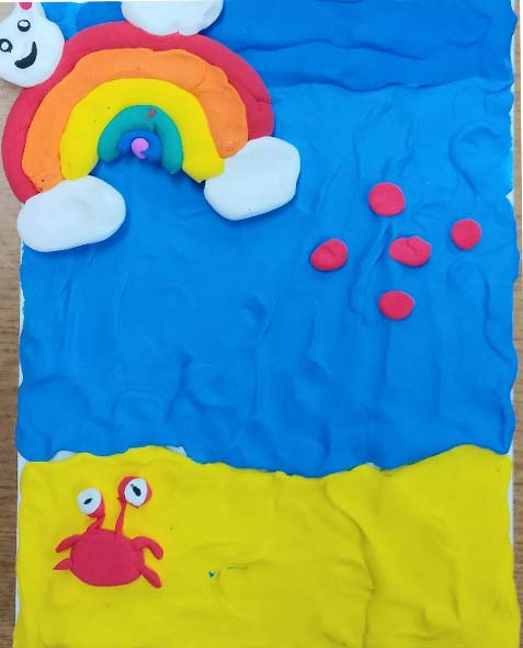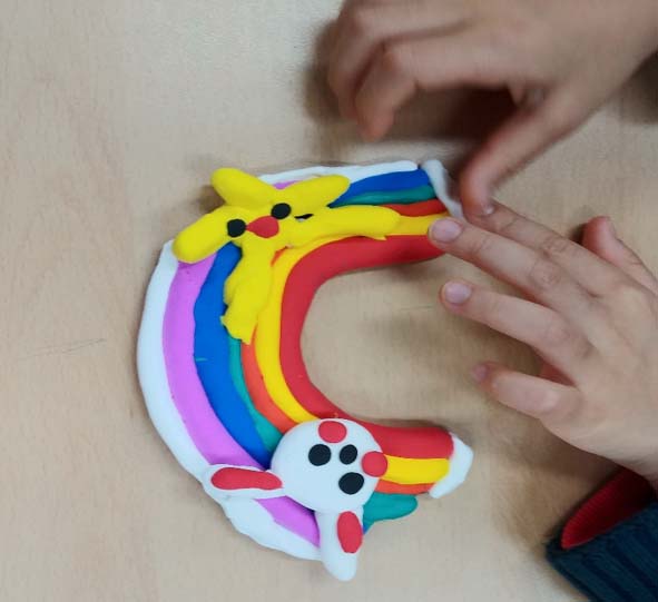 위의 어린이는 무지개 위에 토끼도 있고 해님도 있네요. 과연 무슨 생각을 하면서 만들었을까요? 이렇게 어린이들은 각각의 이야기가 있는 다양한 칼라클레이 작업을 완성했습니다. 서로 이야기 나누고 의견을 물어보며 만드는 과정을 통해 또래 관계도 더욱 돈독해지는 것을 볼 수 있어요. 돌봄 교실 안에서의 즐거운 미술 활동 시간은 아이들에게 창의력 향상의 시간이 되기도 하지만 더 중요한 것은 마음껏 하고 싶은 대로 만들어 보는 과정을 통해서 해소와 치유의 시간이 된다는 점입니다. 그러므로 될 수 있으면 모든 아동들에게 지지와 격려와 칭찬을 많이 해 주려고 노력합니다.