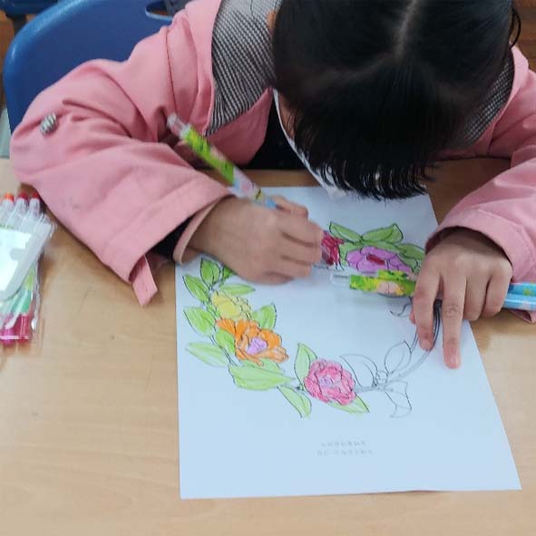 오늘은 아이들이 다니는 학교의 교화를 그려보았어요. 동백꽃을 그리기로 하였는데 저학년 아이들 이기에 동백꽃이 그려져 있는 도안을 주었고 그 도안을 보고 상상력을 더하여 추가로 그림도 그리고 색을 선택해서 색칠하는 시간이었습니다.