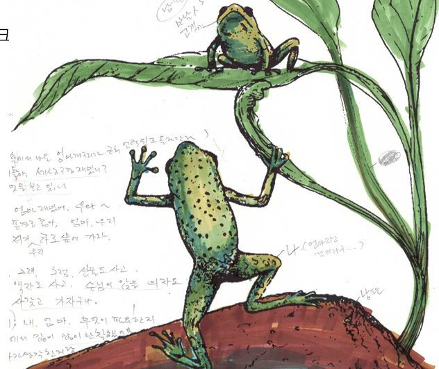 위의 그림은 마커라는 도구를 이용하여 칠한 것으로 색칠한 흔적들로 보아 빠르게 칠한 속도감을 느낄 수 있으며 스토리의 내용이 제법 길게 쓰여졌습니다. 아마도 그 당시 하고자 하는 일이 많았거나 진행되는 일이 있었거나 바쁘게 살아가고 있었을 가능성이 많으며 여기서 중요한 것은 이야기의 내용입니다. 아래의 개구리는 누구이며 위의 개구리는 누구일까요? 그리고 둘은 무엇을 하고 있는 것이고 또 무슨 이야기를 하고 있는 것인지가 중요합니다. 개구리를 무슨 색으로 칠했는지, 우측의 잎 줄기는 무슨색이며 하늘은 무슨 색을 칠했는지 바닥은 어떻게 표현되었는지 등 전체적으로 살펴봅니다. 그 위치와 색들과 이야기는 '나'의 관점이 어디에 있는지 파악할 수 있으며 나 자신이 해결해야 될 것이 무엇인지 알 수도 있습니다. 즉 내 마음을 돌보는 일이라고 말할 수 있습니다. 나를 압박하는 스트레스로부터 벗어날 수 있는 길을 찾아볼 수 있고 잠시 가던 길을 멈추고 숨 고르기를 하는 시간이라고 할까요, 현재의 나의 삶을 점검해 보는 시간이 될 수도 있습니다.