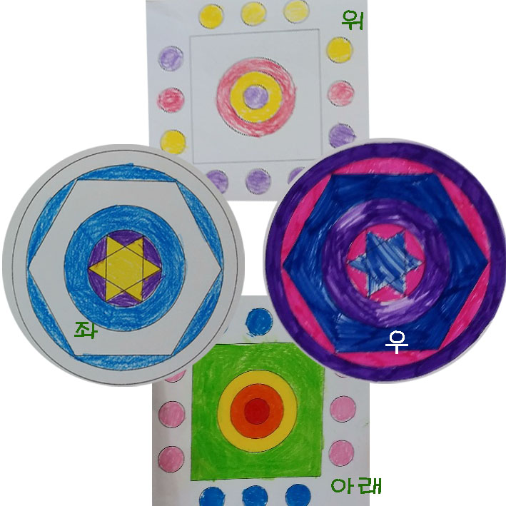 오늘은 아이들 자신들도 모르는 사이에 마음이야기를 색으로 표현하고 있었는데 4가지으 도안을 선택하는 과정에서 가장 많이 선택한 만다라 도안은 위의 그림 사진 중에서 중앙에 별 모양이 있는 도안을 압도적으로 많이 선택해서 칠했습니다. 그다음으로 위아래라고 쓰여 있는 만다라 도안을 선택해서 색칠을 하였고 나머지 도안 중 한장은 한 명도 사용하지를 않았다는 것, 그리고 나머지 한장은 단 30여 명 중에 단 한 명이 사용했다는 것입니다. 이 만다라 도안을 성인들이 선택하는 것과는 많이 다름을 알 수 있었습니다. 사실 아이들이 위의 별 모양 만다라 도안을 선택했다는 것은 지금 현재 많은 스트레스를 받고 있음을 보여 주고 있으며 색칠을 한 것으로 보아도 피곤하다고 힘들다고 말하고 있는 것 같습니다. 그다음 위의 그림에서 위아래라고 쓰여있는 도안을 선택한 아이들이 하는 무언의 말들을 보면 친구들과의 관계를 중요시하고 있는 듯 보이며 아래의 만다라는 그 또래 관계에서 힘들지만 주도적인 면이 있으며 위의 만다라 도안에 색칠된 것을 보면 약간 위축되어 있거나 친구들과의 관계에서 힘들다고 느끼는 면들이 있다는 것으로 보입니다. 이렇게 아이들은 자신의 마음을 그리고 자기의 상태들을 그림에서 색으로 나타내 보여줍니다. 이런 아이들의 심리상태를 알아주고 그들의 이야기를 들어주고 공감하며 포옹해 준다면 몸도 마음도 더더욱 건강하고 밝게 자라날 수 있다고 생각합니다. 오늘도 다시 한번 아이들의 마음을 알 수 있었으니 다음에는 그 마음을 편하게 해주는 쉴 수 있는 시간을 만들어 주고 싶습니다.
