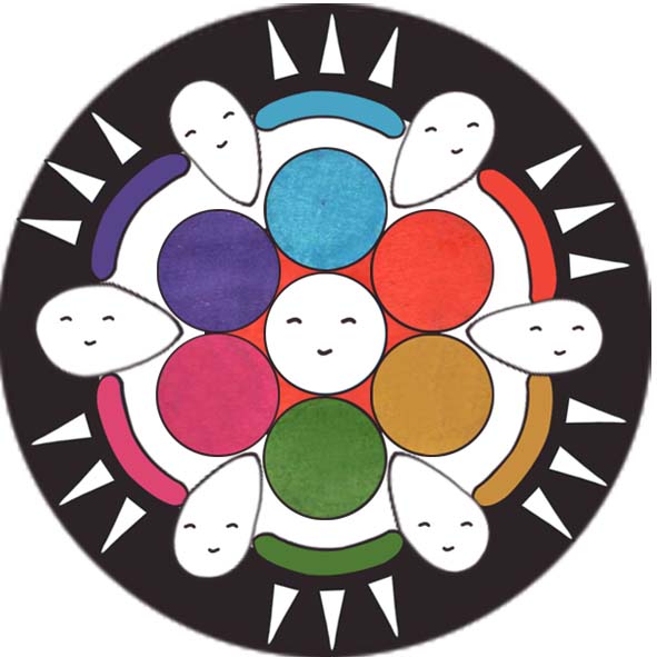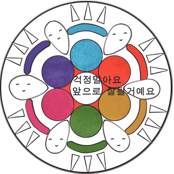 만다라의 상징이 의미하듯이 중앙의 원부터 가장자리의 6개 원은 우리가 원하고 희망하는 것을 나타낸 것으로 그 희망하는 것들이 이루어지길 바라는 소원을 담았습니다. 물방울 모양은 기쁨을 상징하고 있어요. 좋아서 펄쩍 뛰는 모양을 하고 있다는 따옴표를 간단히 표현한 것입니다. 테두리의 긴 삼각형 모양은 웃음이 퍼져나간다는 의미를 담아보았습니다.