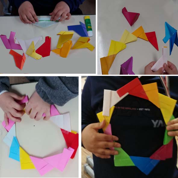 각자 선택한 색종이로 고깔 모양으로 접어요. 12개 모두 같은 모양으로 접으면 된답니다. 과정이 쉬워서 아이들이 즐겁게 접을 수 있었습니다. 12개를 다 접은 후에 위의 사진에서와 같이 한 방향으로 끼워나가면 되는데 이때 빠지지 않도록 풀칠을 하거나 스카치테이프로 깔끔하게 붙이면 됩니다.