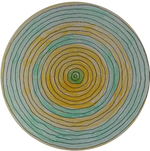 있기도 하고, 한편 피곤함과 우울감이 보이기도 합니다. 그러나 세상을 긍정적으로 바라보며 살고자 애를 쓰고 있는 모습도 있지요. 지금 색칠한 '내가 보는 나'를 색칠 할 때 저는 그러한 생각을 하며 색칠했습니다. 그러므로 그러한 감정들이 색으로 나타나는 것이지요. 중요한 것은 시작한 곳이 어느 지점인지에 따라서 그 사람의 성향을 알 수 있으며 색의 강약, 즉 원색을 많이 사용했는지 연한 색을 사용했는지, 한색과 난색 중 어느 색의 비중이 큰지 등에 따라서 해석하는 시각이 달라질 수 있습니다. 다음으로 '남이 보는 나'를 색칠할 때는 같은 크기의 같은 원형의 도안이어야 하며 이때 중요한 것은 '다른 사람들은 나를 어떻게 생각하는가', 아니면 '어떤 사람이라는 말을 자주 들으며 살아왔는가'를 생각하며 색을 선택하고 색을 칠해봅니다. 이 작업을 진행할 때 가능하면 잔잔한 힐링 음악을 틀어 놓고 하면 많은 도움이 될 수 있습니다. 아래 그림은 다른 사람이 나를 어떻게 보고 있는지, 어떤 말들을 자주 들었었는지를 생각하며 칠한 원형의 만다라입니다. 내가 보는 나를 색칠한 것과 남이 보는 나를 색칠한 것을 보면, 정말 많이 다르다는 것을 알 수 있습니다.