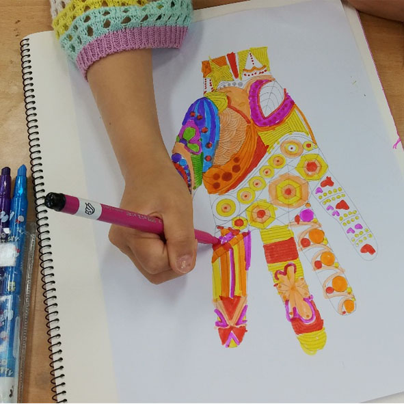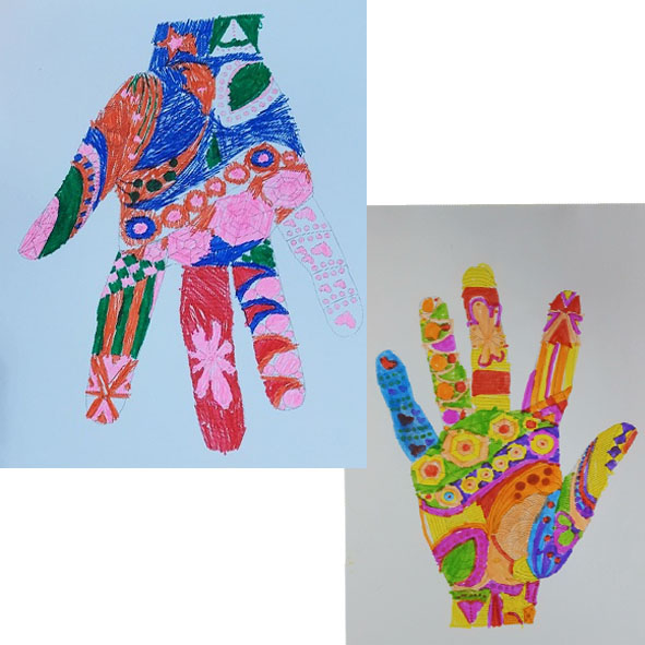 5월의 봄날 이지만, 한여름 같은 무더위가 계속되는 요즈음, 아이들도 지쳐있는 상황이므로 오늘은 쉬어가는 시간이라 생각하고 쉽게 재밌게 할 수 있도록 준비해 보았습니다. 손 그림 안에 이렇게 다양한 선들로 디자인을 할 수 있다는 것을 알아가는 과정도 미술 교육에 중요한 과정이라는 생각이 들었어요.