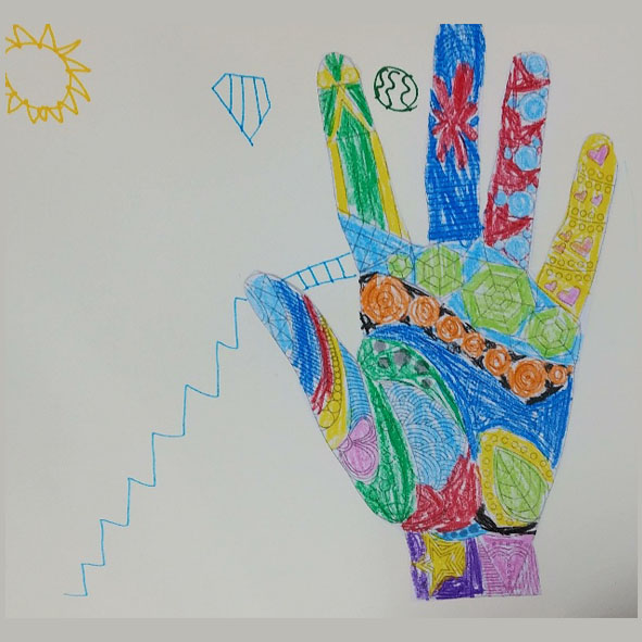 위의 그림을 그린 어린이는 손 젠 탱글 색칠하기를 마친 후에 간단하게 배경을 그렸어요. 왼쪽으로 계단이 보이고 손가락 사이에는 사다리를 그린 것이 보입니다. 날씨가 더운 까닭에 태양도 그렸고, 손가락 검지와 장지 사이에는 수박을 그린 거라고 이야기를 합니다. 상상력이 아주 풍부한 그림이지요. 어린이들의 그림에 종종 보라색이 나타나는 것을 볼 수 있는데 어린이에게 있어서 보라색이 상징하는 것은 엄마나 아빠에게 관심받고 싶은 마음, 애정일 수도 있으며 어떤 관계에 대한 불안함 일수도 있어요.