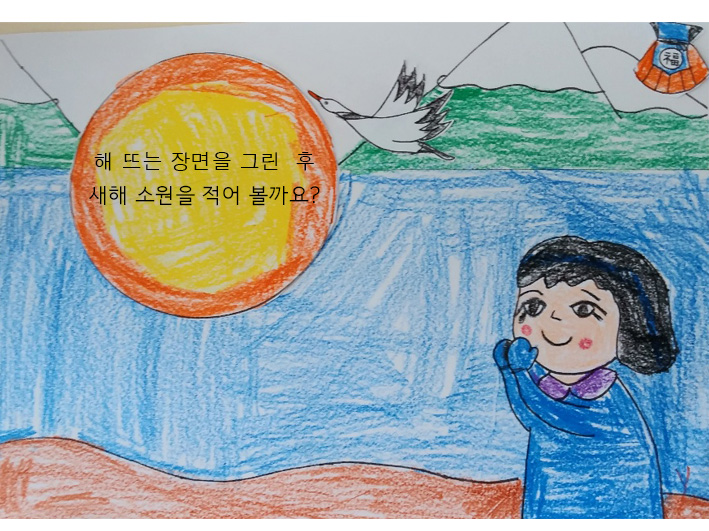 오늘은 아이들의 눈높이에서 새해를 맞이해 마음 준비를 하고 긍정의 마음으로 잘 살아가기를 바라는 마음으로 새해 소원 장면을 그린 후 자기의 소원이나 꿈을 써 보는 시간을 보냈습니다. 가위와 풀도 사용하는 수업이므로 완성된 장면을 예시로 보여주며 작업 과정을 설명해 준 다음에 활동에 임할 수 있도록 하였습니다. 이런 수업을 진행할 때 늘 강조하는 것은 제가 준비한 결과물들은 완벽한 것이 아니라는 것, 그리고 그대로 따라 하지 말 것을 강조합니다. 그리고 미술활동에는 늘 상상하고 생각해서 색을 사용하도록 권장하는데, 이런 설명을 해 주면 어른의 생각을 뛰어넘는 이야기가 담긴 그림들이 완성되는 것을 많이 보아왔습니다.