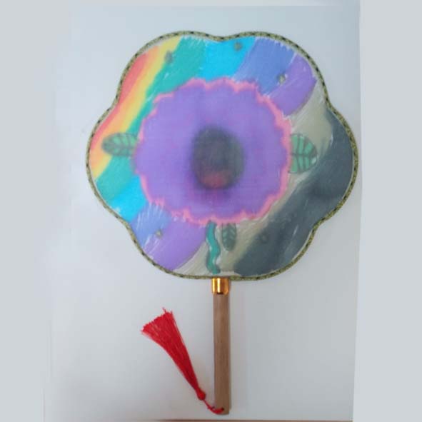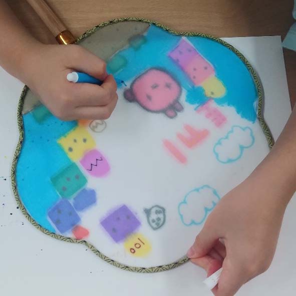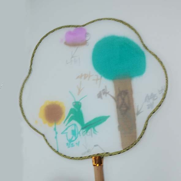 천으로 된 부채에 그림이 완성된 것입니다. 1학년 어린이가 표현한 것인데 중앙에 꽃 한 송이가 있고 주변으로는 무지개를 그려 완성한 부채입니다. 단 한송이의 꽃이지만 몽환적이고 신비스러운 분위기를 보여주고 있네요. 이 어린이에게 저 꽃이 상징하는 것은 무엇일까요? 그 의미나 마음속 이야기가 궁금해지는 그림이었습니다. 작은 꽃을 그리려고 했는데 그리다가 보니 점점 커져서 큰 꽃이 되었다고 하네요. 그린 후 매우 만족해하였습니다. 박수를 보냅니다. 짝짝짝!