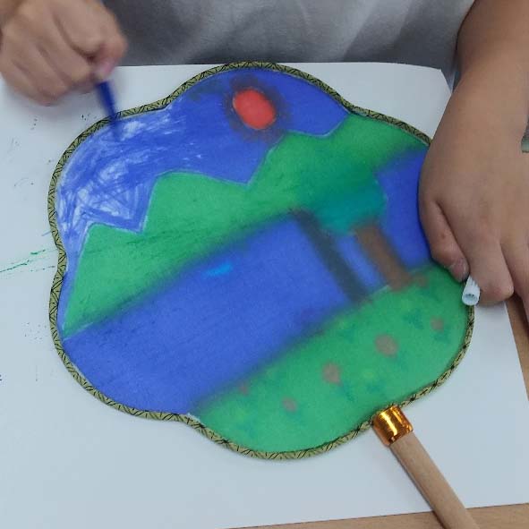 천으로 된 부채와 페브릭 펜, 간단한 재료로 상상력이 풍부하여 볼거리가 많은 부채 그림들이 탄생되었어요. 위의 어린이는 사진에서 보시는 바와 같이 여름철 수박과 아이스크림, 바닷가의 갈매기와 태양등 마음이 가는 대로 즐거운 그림을 그리고 있습니다. 밑그림을 그리지 않아도 쓱쓱~ 표현해 내는 아이들의 풍부한 상상력은 늘 저를 감동시킵니다.