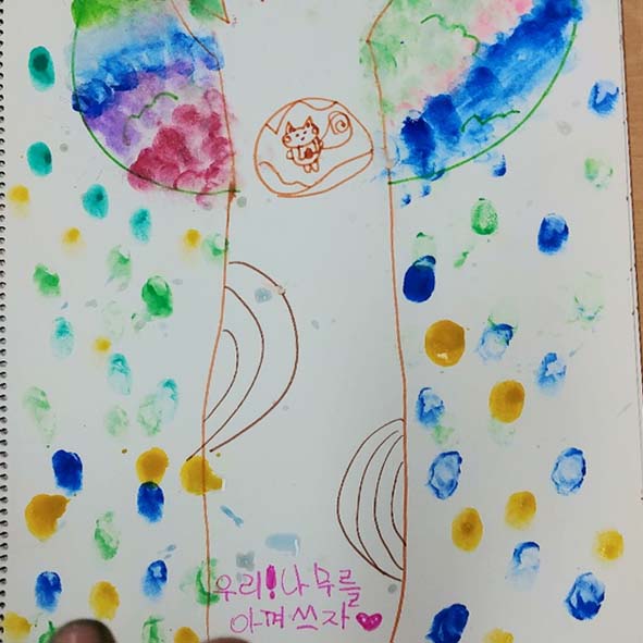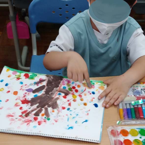 오늘은 어린이들이 수채화물감 사용하는 것과 손가락으로 그림을 그리는 과정이 모두 잘 순조롭게 진행되었던 것 같아요. 1학년 아이들이기 때문에 더 많은 지도가 필요할 것이라고 생각했었지만 오늘은 무리 없이 잘 진행되었어요. 몇 차례 물감을 사용해 보며 시행착오를 거친 교육적 효과임을 알 수 있었습니다.
