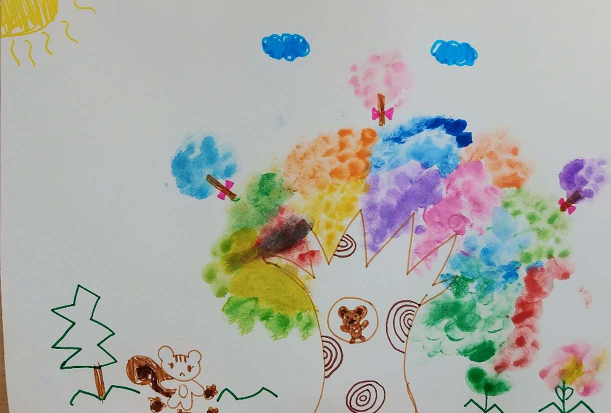 25명 정도의 어린이들이 수채화 작업에 참여하였는데, 나무기둥, 나뭇가지, 손가락으로 찍어서 표현한 나뭇잎들의 표현은 모두 다양했으며 같은 그림이 하나도 없었습니다. 이렇게 그림에서도 어린이들의 성향과 개성이 뚜렷하게 나타났음을 알 수 있어요. 저학년 어린이들이지만 아미 자신의 생각과 주관이 뚜렷하다는 것이지요.
