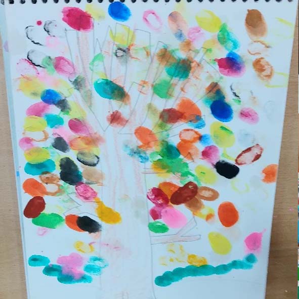 위의 사진 두 개의 어린이의 작업 과정을 보면 개성이 강한 것이 보여요. 스케치북의 방향과 나무기둥의 크기나 굵기가 많이 이 다른 것을 볼 수 있어요. 위의 사진은 밝고 경쾌하나 가벼운 느낌으로 표현되고 있으며 봄의 기운이 느껴지는 것 같고, 아래의 그림에서 나뭇 기둥은 대단히 긁게 그려졌으며 강인하고 튼튼한 이미지를 보여주고 있어요. 손가락을 찍어서 그리는 나뭇잎들의 표현도 거칠지만 경쾌하고 시원시원한 느낌을 주고 있습니다. 어떤 분위기의 그림이든 어떤 표현을 하였든 중요한 것은 어린이들이 재미있고 즐겁게 작업을 진행했다는 것입니다.