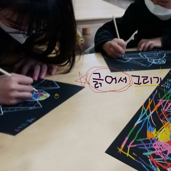 친구들에게 오늘의미술활동에 대하여 간단히 설명을 한 후 두 가지 중 선택할 수 있다고 하였는데 모든 아이들이 스크래치 기법의 미술활동을 선택하여 깜짝 놀랐습니다. 미술의 표현기법 중 색종이 조형작업으로 재미있는 시간을 보내려고 준비해 갔었는데 아이들은 모두 스크래치 기법을 선택하였어요. 스크래치 기법을 이렇게 좋아할 줄은 몰랐네요.