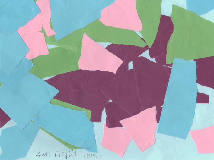 이렇게 조물락거리고 만지고 찢어내는 과정을 통해서 감정은 움직이고 스트레스와 감정이 쏟아져 나오게 되는데 이로서 미술재료로서 도화지는 시각적인 경계로서 가장자리의 이미지는 의외로 강력하며 색종이는 이런 감정들을 형태로 표현할 수 있는 도구가 되는 것입니다. 이렇게 종이 찢기 작품을 다 마치고 나면 각자는 작품에 담긴 자신의 감정을 볼 수 있는데 그 시각화된 감정, 고통, 스트레스에 대하여 이야기를 나누는 시간이 마련된다면 우리의 몸과 마음은 힐링의 시간이 될 수 있다고 생각합니다.
