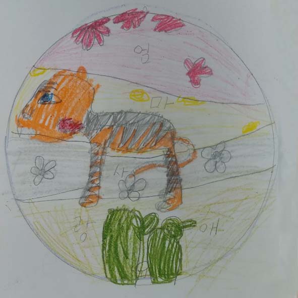 만다라를 그리는 과정에 몰입하고 집중하다 보니 어느덧 일어서서 그림을 그리는 아동들도 있었고 다양한 이야기를 나누며 그림을 그리는 아동들도 있었습니다. 위의 만다라 그림을 그린 아동은 질문도 많이 하면서 작업을 진행했는데 내적으로 일어나는 감정들과 마음의 소리였다는 생각이 듭니다. 호랑이를 그리다가 선들을 그어서 봄 여름 가을 겨울이라고 하였고 그 안에 계절마다 피는 꽃들이 무엇인지 질문을 하며 꽃을 표현하여 그렸습니다. 만다라 안에 스스로 어떤 구분 선을 그었다는 것은 마음속 깊숙이 자리 잡고 있는 어떤 경계선 같은 것으로 보이는데 그 경계선의 의미는 어떤 일에 대한 불안감일 수도 있으며 단절의 경험 일수도 았습니다. 엄마와 늘 멀리 떨어져 지내야 했던 것에 대한 보고픈 마음들이 소외된 감정으로 드러난 경우로 보이기도 하는데 어린이들에게서 자주 보이는 현상이기도 합니다. 이 아이들에게 가장 중요한 것은 부모님의 사랑이며 그다음이 또래 관계, 그리고 학교생활이 가장 영향을 미치니까요. 집을 나와서 학교에 머물러 있다가 다시 집으로 돌아가는 시간 특히 집으로 다시 돌아가는 시간을 아이들은 가장 많이 기다리는 시간입니다. 청소년이 되고 성인이 되기 전에 가장 큰 영향을 받는 곳이기도 합니다. 부모님을 만나러 가는 곳이니까요. 아이들은 부모님의 사랑 안에서 몸도 마음도 건강하게 자라날 수 있으니까요. 위의 그림에서 호랑이 그림 그리기로 시작했으나 엄마를 사랑한다는 말로 끝냈음은 그 부모님의 사랑을 간절히 바라고 있는 것일 수도 있습니다.