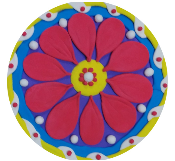 어느 날 내 앞에 듬뿍 샇여 있던 칼라클레이가 있었습니다. 이것은 나의 것은 아니었고 경로당 어르신들을 위하여 사용될 칼라클레이었는데 어르신들이 좋아하실 것을 생각하니 나의 마음까지 설레고 기뻤지요. 수업을 위해서는 참고로 보여드릴 완성품이 있어야 하므로 바로 작업을 시작했는데 일단 기쁜 마음, 열정의 에너지를 표현하는 에너지 만다라 작업을 진행하였습니다. 그런데 저는 왜 만다라라는 작업을 했을까요? 칼라클레이로 만들 수 있는 것들이 어마어마하게 넘쳐나는데도 이 날은 저도 모르게 무언가를 만들기 시작했는데, 동글동글 굴리며 원을 만들고 있었습니다. 이 크기는 성인 머리의 두 배 크기로 제법 큰 사이즈이므로 만드는 과정에서 많은 힘이 들어갔습니다.