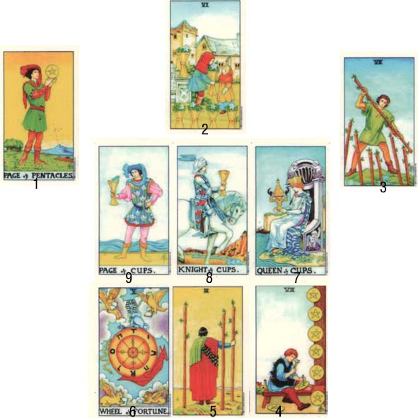 위의 사진에서 보이는 타로 가드는 마음을 모아 스프레드 후 한 개인이 뽑아 놓은 것입니다. 위의 타로카드가 소원을 이루고 확신을 주는 카드라는 것이 아니라 단순히 설명을 위해 뽑은 것임을 다시 한번 강조합니다. 위의 카드 위에는 번호를 써놓은 것을 볼 수 있는데, 원하는 것을 이룰 수 있을지 아니면 어려울지에 대한 믿음과 진솔한 마음으로 타로 카드를 뽑아야 하며 뽑았을 때 카드를 놓는 순서와 위치입니다. 1번의 타로 카드가 주는 의미는 현재의 마음가짐과 그 상태를 나타내는데 어떤 관련된 문제라든지, 자신에게 영향력을 행사하는 내면의 힘 같은 것들을 상징하고 있습니다. 2번의 타로카드는 질문하시는 분의 소원하는 것, 원하는 것에 대한 초조함이나 불안함을 달래주는 요소로 다가오는 것이며, 3번은 현재 당신의 문제를 직관적으로 표현하여 나타내 주고 있습니다. 또는 어떠한 문제점들을 해결하고 알기 위해서 타로카드를 접하게 된 상황과 그 완성을 위해 자신이 마음속에 지니고 있는 이미지들 일수도 있습니다. 4.5.6 번은 이러한 것들에 관계되어서 작용하는 어떤 일들이나 기회를 얻기 위한 시간들이며, 7.8.9번은 소원하는 것을 이룰 수 있는가에 대한 최종 마무리라고 보면 되겠습니다. cups9를 보통 소원의 카드라고 보고 있는데 이 카드가 안 나온다고 해석이 안 되는 것은 아니지만 결국은 이 소원이 카드가 나온다면 소원을 이룰 수 있는 확률이 높다는 것을 암시하고 있습니다. 반면 장애물이 되는 카드가 나온다면 거의 불가능하다고 볼 수 있습니다.