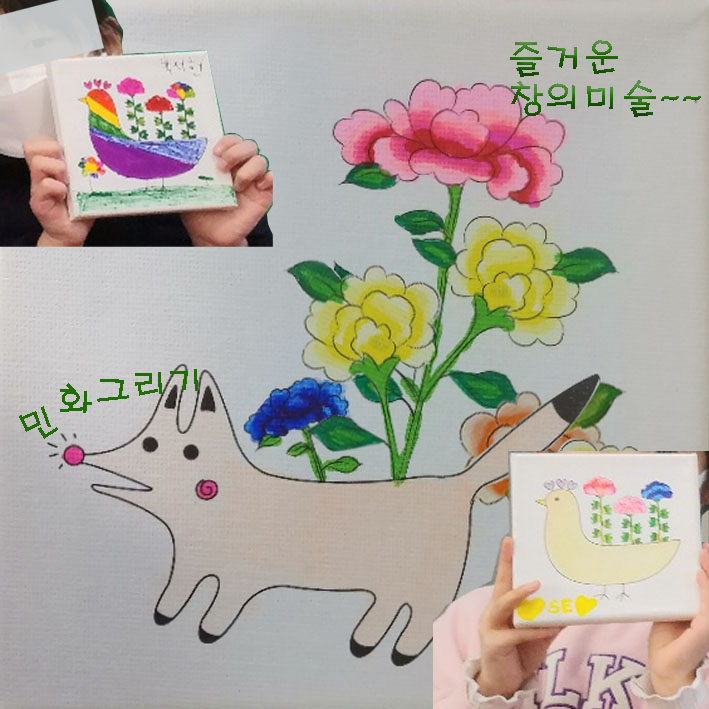 오늘은 캔버스그려진 다양한 민화 그림 중에서 하고 싶은 것을 선택하여 그려보는 시간이었습니다. 색칠 재료도 색연필이나, 마커나 네임펜 등을 준비하였으며 그 안에서 선택하여 칠할 수 있도록 합니다. 미술시간이나 공예, 조형활동 시간에도 재료의 도구 등은 선택해서 할 수 있도록 배려해 준다면 할 아이들의 집중력과 성취감은 더욱 높아진다는 것을 알 수 있었습니다. 어린이들은 자신들이 선택한 재료에 대해서 서로 의견을 교환하는 등 활발한 이야기가 오고 가는데 이런 시간들을 어린이들은 매우 즐거워합니다. 그러므로 선택한 것에 대한 느낌이나 선택 이유 등을 물어보면서 아이들이 모두 답변할 수 있는 시간을 주는 것이 중요하다고 생각합니다. 이날은 수업 시간 내내 이야기를 나누며 민화 그림 그리기 시간이 이어졌습니다. 제가 이날도 느낀 바는 재료의 중요성입니다. 민화 그림을 칠하는 과정에서 가장 중요한 것은 색칠 도구인데 그 도구가 미흡할 경우에 짜증스러울 수 있고 집중력이 흐트러진다는 것입니다. 결국 여기저기서 빌려 쓰게 되면서 산만한 가운데 집중력을 잃게 된다는 것이지요. 그림을 그리거나 만들거나 하는 그런 시간들은 재료가 충분해야 된다는 것입니다. 넉넉한 재료들은 아이들의 자존감 형성에도 중요한 요소가 되는데 자신들에게 주어지는 넉넉한 재료들을 통해서 무의식적으로도 만족감을 주지만 아이들의 표정도 밝은데 이러한 과정들도 아이들의 자존감 향상에 도움을 줄 수 있다고 생각합니다.