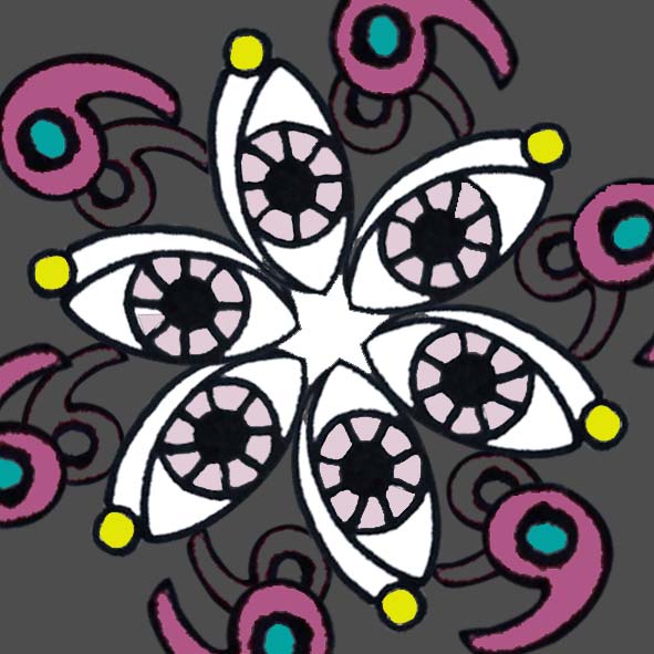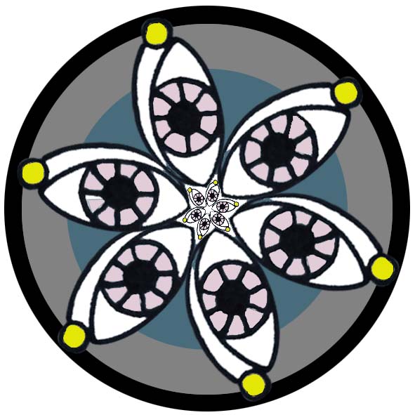 중앙을 유심히 보면 그 안에도 사람의 눈 모양들이 모여 꽃처럼 피어있는 것처럼 보이는데, 한편으로는 6 각형 모양의 별을 그린 것이라고 합니다. 이것은 별처럼 빛나는 삶이길 바라는 마음과 밝은 모습을 살아가고 싶은 마음이 표현된 것으로 보입니다. 만다라 그림의 중심부에 있는 6 각형의 별 모양이 상징하는 것과 눈 모양 즉 집중을 상징하는 눈의 꽃도 6개인 것과 눈물방울도 6개, 그리고 제일 위에 있는 집중의 만다라 그림에 나타난 6이라는 숫자의 의미는 무엇일까요?
