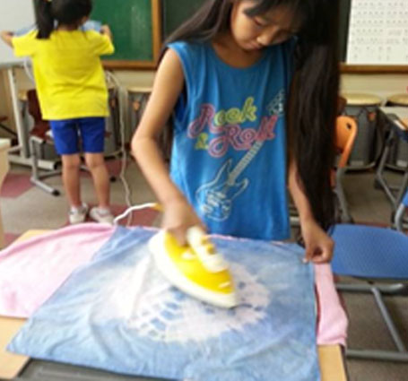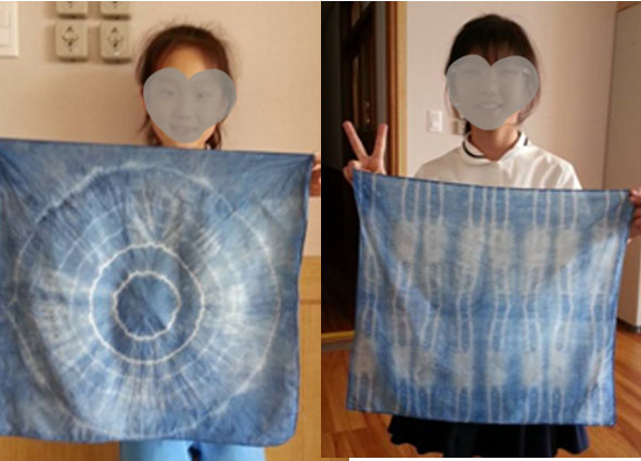 이렇게 바느질하거나 묶어서 염색 후 다시 제거한 후에는 다림질을 꼭 해주어야 해요. 염색 과정에서 많이 구겨져 있는 상태이므로 다림질을 해주면 무늬들이 선명하게 나타나요. 이렇게 쪽 천연염색 손수건 만들기 작업은 끝납니다. 이런 천염염색 작업을 통해서 우리나라의 전통 염색방법에 대해서 학습하고 체험해 보는 기회가 된다는 것이 중요한 것 같아요. 이러한 염색 과정이 다소 복잡하기는 했지만 이런 과정들을 신기해하기도 하면서 정말 신중하게 염색 작업에 참여하는 어린이들이 모습을 볼 수 있었어요. 그리고 자신이 만들어낸 쪽 천염염색 손수건 결과물에 대해 매우 만족해하고 서로 자신의 것들과 비교도 해 보면서 기뻐 했던 모습들이 눈에 선~합니다.