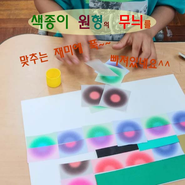 이 수업을 진행하기 위해서 일반적으로 가장 많이 쓰이는 15x15 size 색종이와 크기가 다른 종류의 색종이들도 준비해 놓았습니다. 어린이들 스스로 필요에 따라서 갖다 쓰도록 하였지요. 위의 어린이는 5x5 size의 원형의 무늬 색종이를 이용해서 모자이크 같은 패턴을 만들고 있습니다. 이렇듯 어린이들의 상상력에서 나오는 아이디어는 저의 상상력을 뛰어넘었고 저의 고정관념을 뛰어넘었습니다. 어린이들의 무궁무진한 상상의 이야기들을 통해 제가 더 비우는 시간들이었어요.