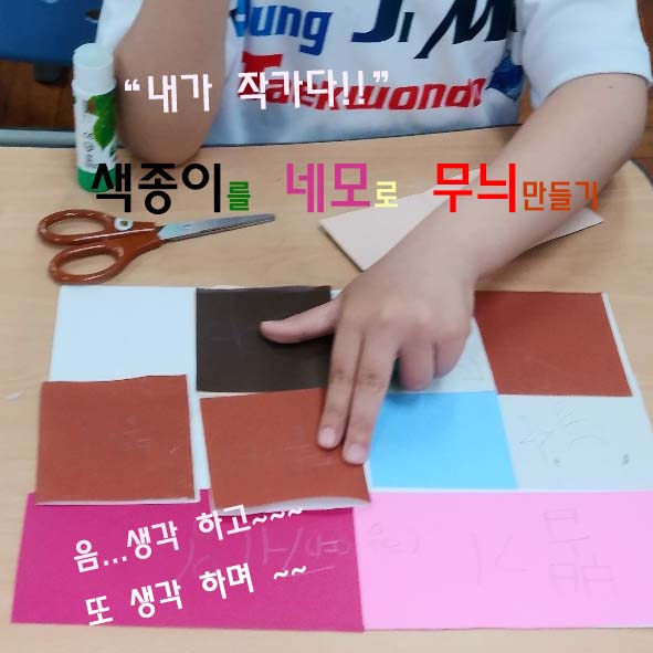 위의 어린이는 자신이 좋아하는 색종이를 골라서 이곳저곳에 자리를 잡아 보는 중입니다. 어느 곳에 붙여서 작품을 만들까 저도 기대해 보았어요. 네모 칸마다 이야기들을 싸 놓았던 것이 인상적이었어요. 그리고 그 글들이 잘 보이지 않게 도 하나의 색종이로 덮어두었었는데, 제가 하나를 뽑아보았는데 매우 기분 좋은 내용이어서 저도 모르게 환호성을 질렀습니다. 정말 아이디어가 뛰어난 어린이였어요.