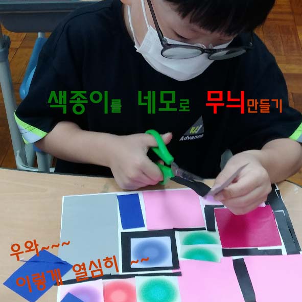 위의 어린이의 잡 중력은 대단했습니다. 2학년으로서 50분 동안 움직이지 않고 작업을 한다는 것은 보통 집중력이 아니거든요. 고사리 같은 손으로 가위 사용도 이젠 능숙해졌어요. 몬드리안 작가 작품의 특성 중 하나인 검은색 테두리 작업을 아이들도 잘 따라 했습니다. 위의 어린이처럼 굵기와 크기가 다른 검은색 색종이를 오리는 것이 특이하고도 새로운 작업이었던 것 같아요. 이 어린이도 아주 재미있게 작업을 완성하였습니다.