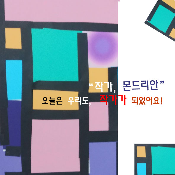 오늘은 색종이를 사용하여 어린이들 각자의 마음이 담긴 몬드리안 작품을 만들어 보았어요. 몬드리안 작가의 작품을 해보겠다고 말하니 어린이들이 매우 좋아하더라고요. 어떤 어린이는 "그럼 우리도 화가가 되는 거예요?" 라며 귀여운 질문을 하더라고요. 어린이의 순수한 마음이 우러나는 질문이었어요. 차가운 추상의 의미를 간단히 설명한 후 칠판 위에서 하는 방법을 간단히 설명해 주었어요.