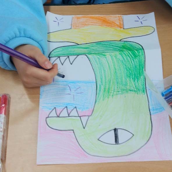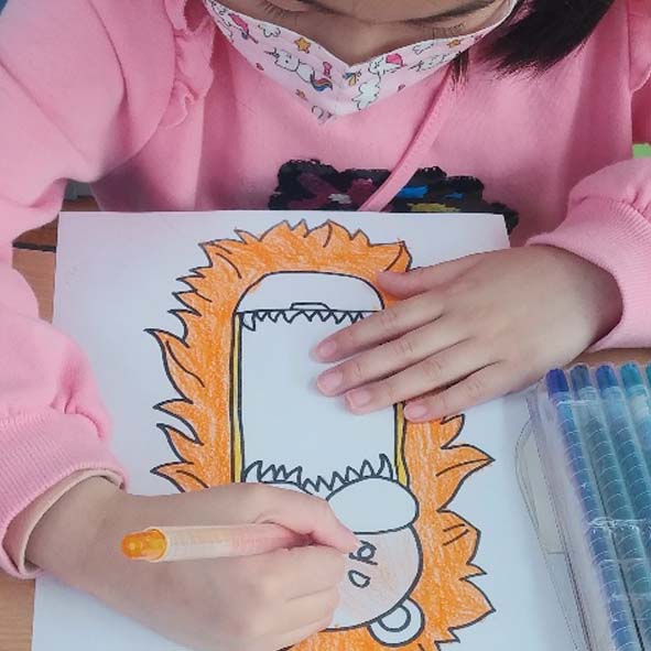 오늘 창의 미술은 동물 캐릭터를 색칠할 거예요. 정해진 색이 아니라 상상해서 색칠해 보는 시간입니다. 색칠하는 과정을 마치면 가위로 오린 후에 그려진 선에 따라 접은 후 움직여서 갖고 노는 시간을 마련했습니다. 이 과정을 이미 해 본 어린이들도 있고요, 처음 해보는 어린이들도 있을 거예요. 이미 해보았던 어린이들은 더욱 창의적인 결과물이 나올 거라고 지지해 주면서 새로운 작품을 만들어 보라고 하면 또 다른 완성작이 만들어진답니다.
