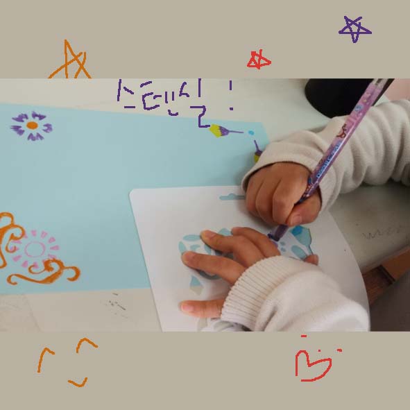 위의 사진은 다양한 무늬 중에서 각자 원하는 도안들을 선택해서 알록 달록 예쁘게 색칠하고 있는 모습으로 이렇게 스텐실 도안을 선택하는 순간들을 무척 즐거워했습니다. 어디에 하면 좋을지 서로 의견을 물어보는 과정들을 통해 아이들의 또래 관계도 더욱 자연스러워지는 시간이었고 서먹서먹했던 관계가 더욱 친밀해지는 시간이기도 했어요. 아이들이 재밌고 신나게 미술활동을 하는 모습을 보면 저에게도 기쁜 에너지가 전해져 와 행복한 시간을 보내곤 합니다.