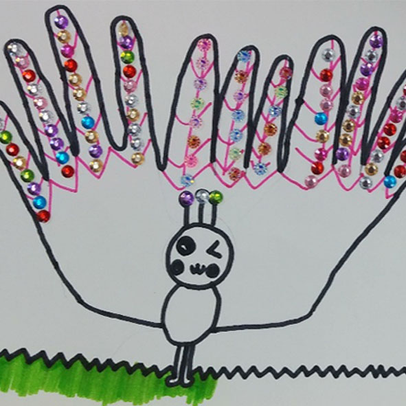 위의 어린이는 자신이 좋아하는 색지에 손을 세개 그렸고 색칠한 후에 가위로 오렸어요. 그리고 스케치북에 붙이기 위해 위치를 잡고 있는 과정입니다. 공작새의 화려함을 표현하기 위해서 색칠한 후에 반짝이는 예쁜 스티커를 붙이고 있어요. 공작새의 얼굴도 본인의 상상력을 더해서 그려본 후 색칠해 봅니다.