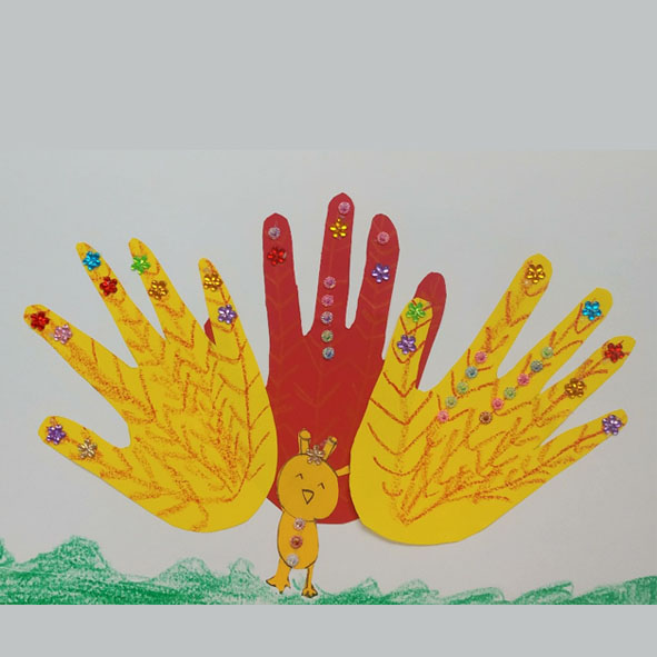 각자의 손을 그린 후 공작새를 만드는 과정인데 각양각색으로 다양하게 표현 되고 있었습니다. 어린이들마다 각각의 정성스러운 마음이 담긴 창의적이고 재미있는 공작새들이 완성되고 있어요.
