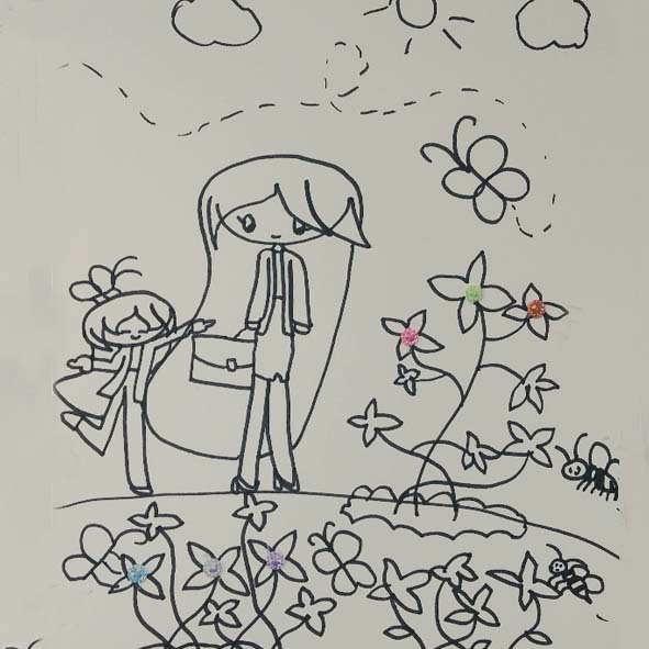 위의 그림은 미쳐 색칠은 못했지만 표현력이 아주 뛰어난 그림입니다. 한참을 생각하더니 검은색 사인펜으로 그린 것입니다. 연필로 밑그림을 그린 것도 아니고 바로 그린 것인데 이리 저리 움직이는 듯한 개나리꽃의 구성도 짜임새가 있고 두 마리의 벌들이 날아오는 모습을 표현한 것도 재미있습니다. 나비도 어디론가 날아가고 있어요. 신난 표정을 하고 있는 아이의 머리 위로 나비 한 마리가 앉아있네요. 이 아이는 엄마와 함께 어디를 가고 있는 것일까요?
