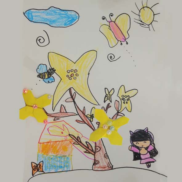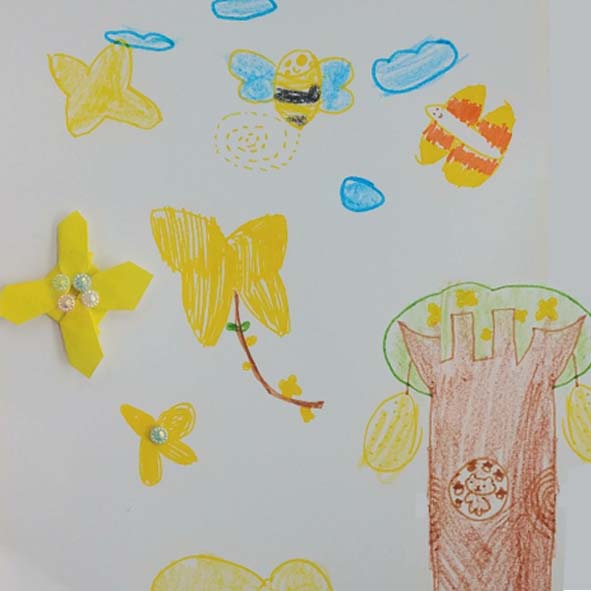 위의 그림도 개나리 꽃 종이접기를 하여 붙이기도 하고 상상하여 풍경을 그린 것입니다. 벌과 나비의 모습이 엉뚱하고 재미있는 것 같아요. 특히 아래 오른쪽에 있는 나무가 인상적입니다. 이곳에 있는 모든 그림들의 특징은 아이들이 연필로 스케치, 밑그림을 그린 후에 한 것이 아니라는 것이 특징입니다. 색연필이나 사인펜으로 마음이 가는 대로 위치를 잡아서 그렸는데 저는 개인적으로 이렇게 그림을 그리는 아이들의 모습을 보면 마술을 부리는 것 같은 신비스러움을 느끼곤 합니다. 우리 어른들이 흉내 낼 수 없는 미지의 영역이란 생각이 듭니다. 오늘의 봄꽃 미술시간도 이렇게 웃으며 마칠 수 있어서 기뻤습니다. 이 글을 읽으신 여러분들도 아이들의 노란빛 동심을 보시고 흐뭇한 시간이 되셨길 바랍니다. 그럼 다음 시간에 또 뵐게요.