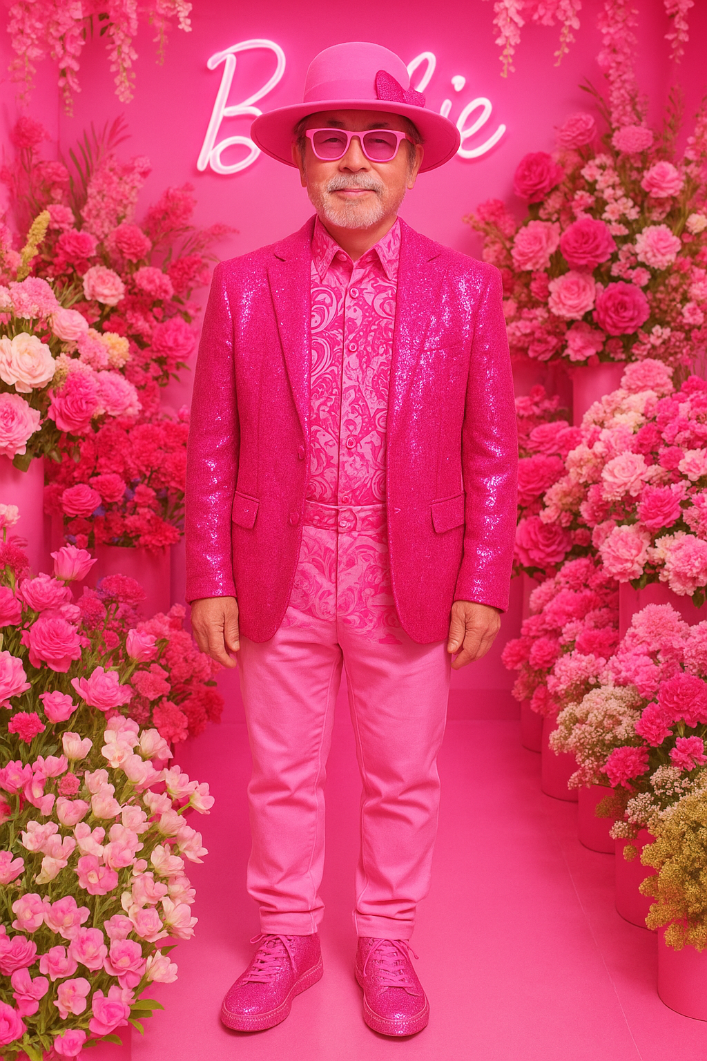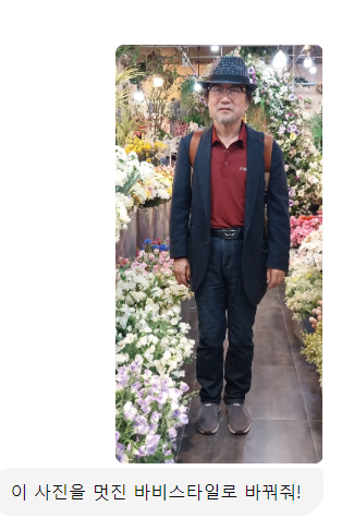 '좋아! 이 사진 속 멋진 분을 바비스타일(BARBIE STYLE)로 바꿔볼게요. 바비스타일은 보통 핑크 컬러, 글램룩, 반짝임, 밝고 화사한 분위기, 그리고 조금은 과감한 패션이 특징이에요. 이 스타일을 반영해서 다음과 같이 바꿔볼게요:'라고 합니다.