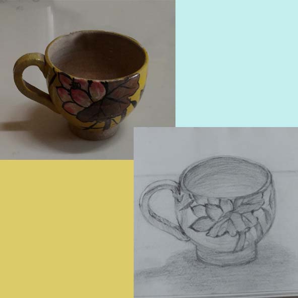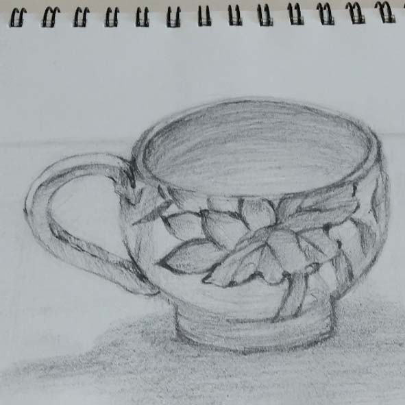 컵을 바라보는 위치와 시선에 따라서 컵의 크기와 모양은 다르게 나타납니다. 그러므로 무작장 그리기보다는 컵의 위치와 모양 구도 크기 방향과 그림자의 위치 등을 잘 관찰해 본 후 그림을 그려야 완성도 높은 작품이 나옵니다. 물론 첫 시작은 큰 그림을 그려야 하지요. 컵의 크기를 그리고 컵의 입구 구멍의 크기와 넓이를 표현하고 손잡이의 위치를 표현하고 그림자를 그립니다. 그리고 다시 세부적으로 관찰해가면서 그려야 하는데 위의 사진처럼 세부적으로 그려도 되지만 성향에 따라서는 시원시원하게 드로잉 하 듯 그려도 좋습니다.