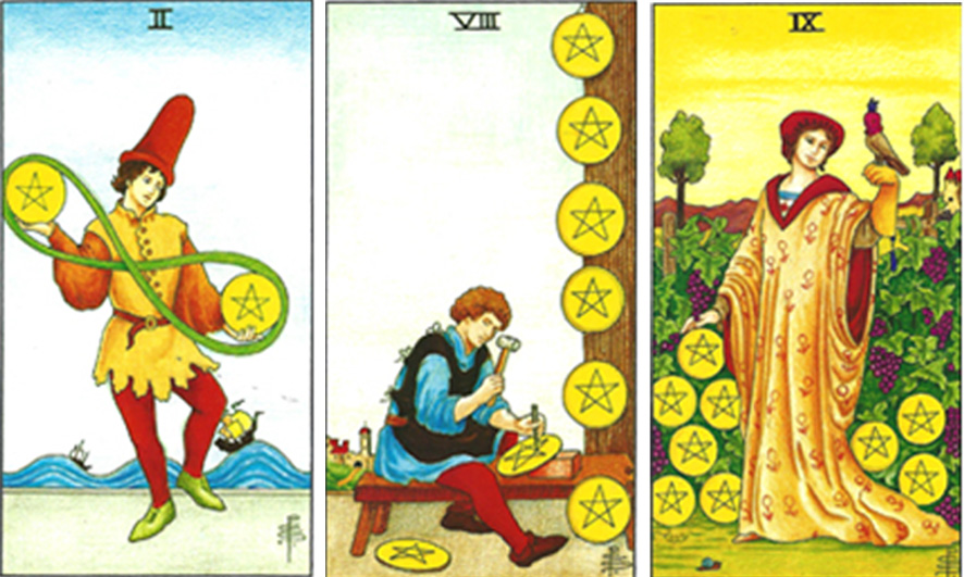 노란색은 주로 행복과 성공을 나타내며 영광과 지혜로움 신용과 정신적인 힘 등의 의미를 담고 있으며 부정으로는 변덕스러움과 부정을 의미합니다. 금색은 원초적으로 찬란한 빛을 상징하 는데 행운과 진리, 너그러움을 뜻하기도 하고 재정적인 이득을 상징하기도 합니다. 부정으로는 허영과 무기력을 의미하기도 합니다. 이제 마이너 카드인 펜타클 카드가 주는 설명을 알아보겠습니다. 펜타클 2번 카드는 붉은 옷을 입은 남자가 양손에 펜타클을 하나식 들고 놀고 있는 모습입니다. 두 개의 동전을 연결하고 있는 녹색의 줄은 무한대의 표시이기도 하지만 이리저리 제고 따지며 강 팡 질 팡하는 상징이고 결단을 못 내리거나 아직은 때가 되지 않은 그 무엇에 대한 암시이기도 합니다. 그리고 펜타클 8번 카드는 열심히 일을 하고 있는데 무엇인가를 열심히 노력하며 성취해 나가고 있음을 의미하고 있습니다. 펜타클 자체에 망치와 정을 이용하여 무언가를 만들고 있는 것 같은데 여기서는 외부의 도움을 받게 되는 일이 생길지라도 운에 의한 것이 아니라 최선을 다핸 노력의 대가라는 상징적인 의미가 있습니다. 또는 반대로 힘들게 노동하고 노력을 해야만 뜻하는 바를 이룰 수 있다는 의미이기도 하지요. 이제 9번 카드를 살펴보겠습니다. 다음으로 9번 카드는 넝쿨째 들어오는 행운의 일들이 있다는 것입니다. 그것이 돈일 수도 있고 또 소원하던 일들이 이루어지는 것일 수도 있습니다.