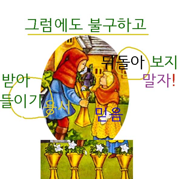 좋았던 추억으로 남는 지난날을 그리워하기보다 이 현실의 삶에서 실마리를 찾다 보면 꽃다발을 안겨주는 타로카드의 그림처럼 그 실마리를 찾게 되고 애쓴 마음을 위로받는 좋은 소식이 있을 것입니다. 그러므로 오늘의 타로 카드 컵의 6번을 간단히 요약하자면 "용서하고 받아들이자. 뒤돌아 보지 말고 현실에 충실하자!입니다.