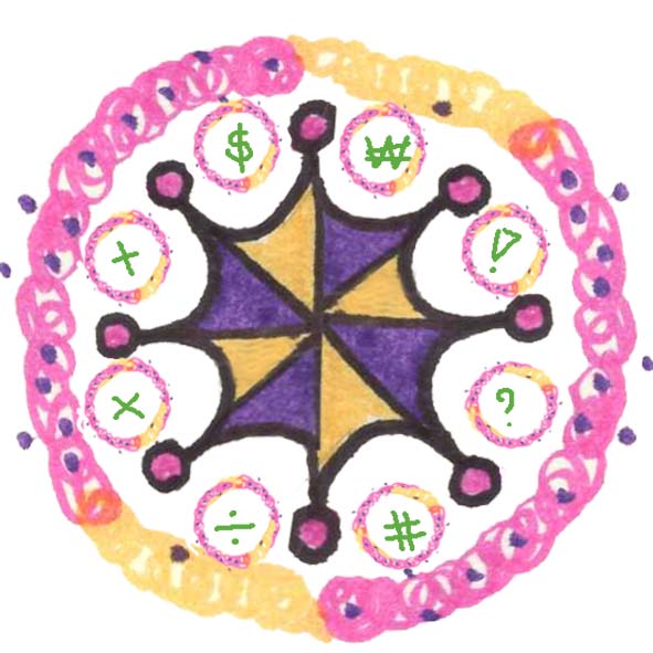중앙의 퍼져나가는 듯한 무늬의 색은 노랑과 보라색이 교차되어 나타났습니다. 어떤 바라는 일들이 있어서 그 일에 대해 이런저런 생각을 하면서 색칠한 것입니다. 가장 테두리의 스프링 모양은 사인펜으로 아무 생각 없이 낙서하듯이 신나게 그렸던 것입니다. 위의 만다라에서 기호들을 보면 더하기, 곱하기, 나누기, 샾, 물음표, 따옴표, 달러, 원의 표시 들은 살면서 다가오는 하루의 일상들을 상징적으로 기호로 표현했습니다. 테두리를 그릴 때의 즐거움과 경쾌함처럼, 단순한 일상 속에서도 재밌게 즐겁게!! 오늘도 힘내요!!
