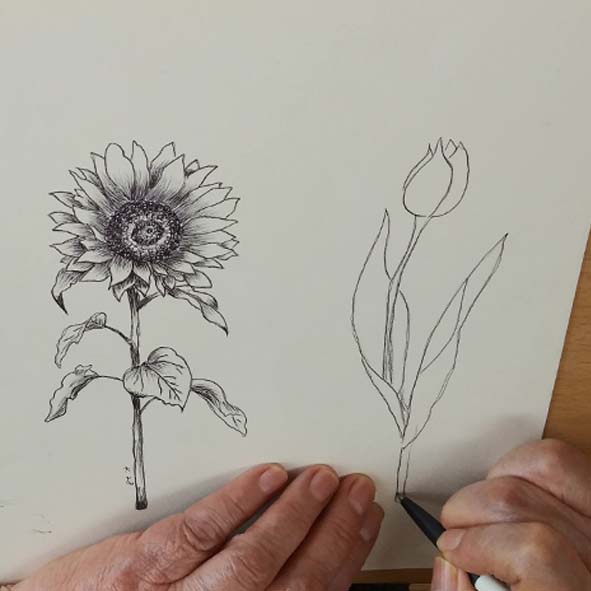 해바라기 꽃 등 꽃 잎이 많은 것들은 밑그림 그리는 시간과 펜으로 다시 얹어 그리는 시간들을 많이 필요로 합니다. 그러기에 우리들의 드로잉 수업 시간에 완성할 수 없어서 집에서 틈틈히 그려보도록 권장하고 있어요. 그럼에도 다 못한 것들은 다시 수업시간에 수정하고 보완하여 완성할 수 있도록 진도를 조율합니다. 우리들이 일주일에 한 번 만나서 그림을 그린다는 것은 기분 전 환도되고 일상생활에서 벗어나 새로움을 만긱하는 힐링이 시간이 되고 있지요. 집중해서 무엇인가 하나의 그림을 완성해 간다는 성취감도 크고, 스케치북이 한 장 한 장 넘어가서 내가 그림 그림들이 쌓여가는 만족감도 커요. 잘하고 못하고를 떠나서 무언가에 집중하고 그것을 끝까지 완수했을 때 오는 기쁨이 있기 때문에 첫 시간에 만난 분들이 수업이 끝나는 날까지 모두 함께 갈 수 있도록 이리저리 마음을 쓰며 이 시간을 엮어가고 있습니다. 이렇게 오늘은 펜 드로잉, 꽃그림 그리기 과정을 소개해 보았습니다. 이 글을 읽으신 여러분들께서도 펜이라는 도구를 활용해서 일상 속 무엇이든 그려보면서 그 안에서 주는 기쁨을 맛보시길 바랍니다. 다음에 또 뵐게요.