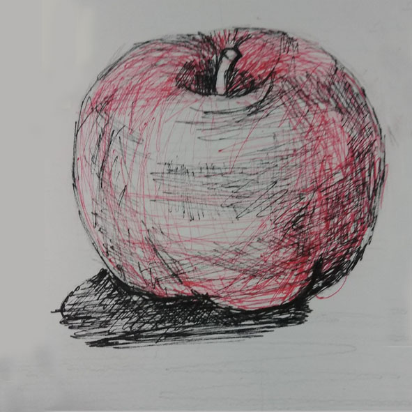 위의 펜드로잉 사과는 어느 정도 완성 후 볼펜으로 색을 넣어본 것인데 훨씬 더 생동감 있어 보입니다. 여기서 중요한 점 하나는 펜으로 그리는 그림은 지울 수가 없으므로 초기 단계에서는 흐리게 그려야 합니다. 그다음에 점차적으로 진하게 그려 주어야 실수를 줄일 수 있어요. 처음부터 진하게 그리다 보면 너무 까맣게 되어 나중에는 수정이 불가능해질 수 있습니다.