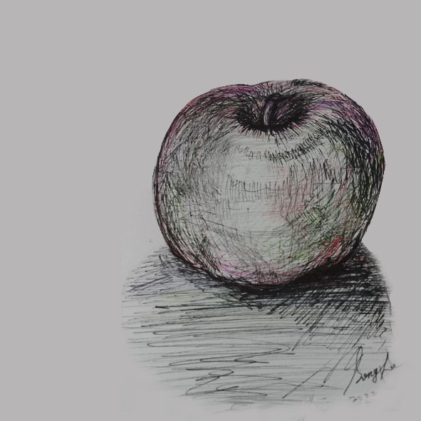 명암의 10단계를 적용해서 그린 사과 펜 드로잉입니다. 사과를 그릴 때 중요한 부분은 사과 중심부의 깊이감이 표현된 사과 꼭지 부분과 동그란 사과의 덩어리감이 느껴지도록 표현하는 테크닉입니다. 그리고 가장 어두운 면인 그림자 그리기입니다. 작은 과일인 사과 하나라도 감각적이면서도 멋스러운 그림을 완성하기 위해서는 무수한 선 연습이 필요해요. 그리고 선의 굵기를 다양하게 사용해야 지루하지 않고 재미있고 완성도 높은 그림이 될 수 있어요.