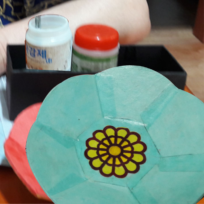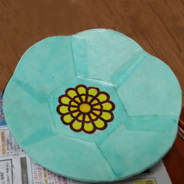 어르신께서 기쁘게 창의적 체험 활동, 한지소품 만들기를 해 내셨다는 것, 그것만로도 만족한 시간이었습니다. 작업 후 어떠셨어요? 하고 여쭤보면 대부분의 어르신들은 재밌었다고 고맙다고 말씀하십니다. 즐거웠다고 웃으시는 모습을 뵙는 것 그 자체로서 제가 이일을 하는 보람을 느꼈던 순간들이었습니다. 코로나 19라는 고통의 시간 이전에 있었던 일이지요. 언제쯤이면 마스크를 벗고 활짝 웃는 모습을 보며 마주할 날이 올까요. 이 글을 쓰다 보니 새삼스럽게 그날이 그리워지며 그때 부담 없이 손을 잡고, 얼굴을 마주 보며 이야기를 나누며 살았던 날들이 추억으로 다가오네요. 위의 소품을 간단하게 만들었지만 다양한 소재를 활용하여 전통을 살린 멋진 소품들을 만들 수 있습니다. 꽃 접시 만드는 순서를 살펴본 후 오늘의 글을 마무리하겠습니다. 우선 꽃 접시가 육면체이므로 6조각의 면들을 오려야 합니다. 앞면 6개, 뒷면 6개, 총 12개의 모형이 필요하고, 초배지도 12개, 선택한 색한지도 12개의 모형이 필요해요. 그리고 중간의 육각형 모양도 각 각 2개씩 재단해 놓습니다. 중앙의 무늬는 그림을 그려서 붙여도 되고 모양 오리기로 해도 되며 다양하게 응용하여 사용 가능합니다. 이렇게 준비된 모형들을 밀가루풀을 이용하여 붙입니다. 풀칠을 손으로 해도 되지만 저는 넙적 붓을 준비하였습니다. 이런 과정을 거쳐 충분히 마른 후에 마감재를 발라 건조하면 발색 없이 튼튼하게 오래 사용할 수 있습니다.