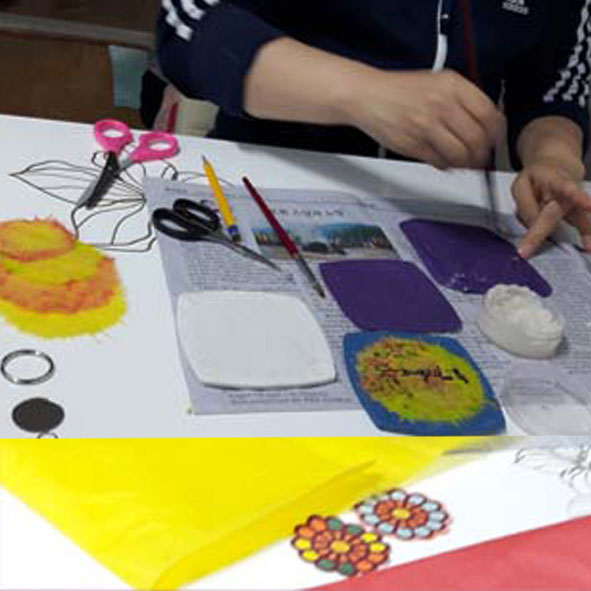 오늘은 돌보아 드리는 찾아가는 예술활동으로 알록달록한 예쁜 한지를 활용하여 컵받침 만들기를 준비했습니다. 그동안 만다라 문양의 육각 꽃 접시 만들기와 들꽃 열쇠고리, 사각형 다용도 접시 등 다양한 한지공예 소품들을 만드는 시간을 마련하였습니다. 물론 이 일은 가정으로 직접 찾아가서 일대 일로 진행하는 프로그램이었는데 코로나19로 잠시 중단했었습니다. 이러한 방문 예술활동의 목적은 활동하기 어려운 어르신들이나 바깥출입이 어려우신 분들을 대상으로 직접 찾아가서 예술활동을 통해 우울증 해소 및 자존감 향상에 도움을 줄 수 있도록 하는 돌봄으로써의 미술활동이며 심리적 안정을 위한 힐링의 시간을 마련해 드리는데 그 목적이 있습니다. 오늘은 다양한 이유로 사람들과의 관계 형성을 못하고 계시는 분을 위하여 컵받침 만들기를 진행하였습니다. 작업을 위한 준비물 중 하나는 다양한 색의 한지를 준비합니다. 색을 많이 준비할수록 좋은데 이 색을 선택하는 과정을 매우 재미있어하시며 자신이 스스로 선택한 색을 사용함으로써 자존감 향상에도 도움을 줄 수 있기 때문에 스스로 선택하여 사용하도록 합니다. 작업의 순서는 우선 만나는 순간마다 즐겁게 인사를 하며 오늘의 미술활동에 대하여 자세히 설명드립니다. 과정들을 설명드리므로 긴장감을 완화시키고 이 활동에 대한 흥미 유발 및 적극적인 참여를 할 수 있도록 하기 위함입니다. 그리고 만들기 작업을 위한 자리를 살펴 마련해 드린 후 활동은 시작됩니다.