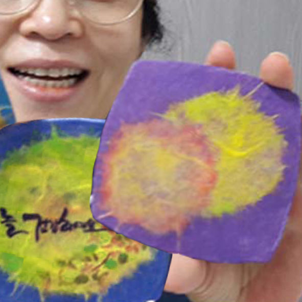 기본적인 만들기 작업을 마치고 나면 꾸미고 장식하는 시간을 진행합니다. 이 날은 한지를 원형으로 찢는 방법을 알려드렸는데 무척 재미있어 하셨던 모습이 생생합니다. 그렇게 찢어낸 한지에 수채화물감으로 터치해 주면 분위기 있는 컵받침 장식이 만들어집니다. 바로 위의 사진에서 좌측에 찍어서 물감을 터치해준 노란색 한지들이 있습니다. 이것을 물풀을 이용하여 붙여주면 컵받침은 완성됩니다. 장식용 한지 조각들은 다양하게 만들어서 사용할 수가 있는데 저는 그 만드는 과정들을 중요하게 생각하고 있습니다. 이렇게 직접 해 보는 모든 과정들을 통해서 스스로 해 냈다는 성취감을 느낄 수 있는데 그렇게 느끼는 감정들, 즐거움들이 이분들에게는 행복한 시간으로 남아 있을 것임을 알기에 책임감을 느끼는 예술활동입니다. 이날 이 만드는 과정을 통해서 이분은 너무너무 즐거워하였습니다. 한 지 컵받침을 한두 개만 만들면 되는 시간이었으나 이날 5개를 만들었습니다. 이렇게 행복해하시고 만족해하며 활짝 웃는 모습을 볼 때 제 자신도 행복하고 함께 힐링하는 시간이 되곤 합니다. 요즈음은 마스크를 끼고 살아가는 시기이다 보니 웃는 모습을 보기 힘든 세상이 되었으나 언젠가는 마스크 뒤에 가려진 우리들의 웃는 모습이 드러날 수 있는 날이 빨리 오길 기원해 봅니다. 또한 이 공간에서 우연히 만난 여러분들, 알록달록한 부드러운 예쁜 한지 색들을 보며 힐링하시길 바라며 우리 마스크를 벗는 그날까지 조금 더 참기로 해요.