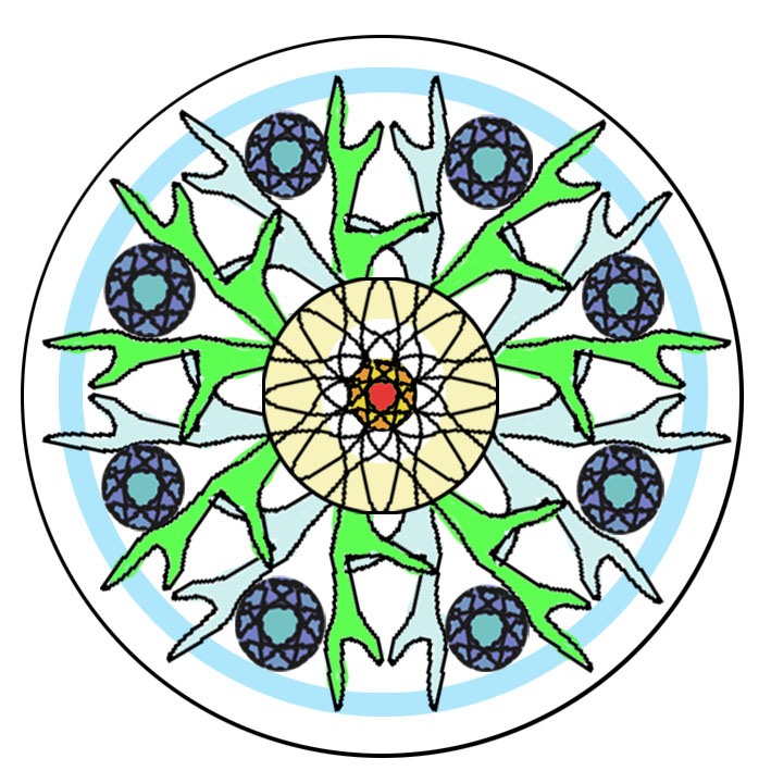 앞날에 대한 기원과 소원하는 바를 바라며 만다라를 색칠했는데요, 주로 차가운 색들을 사용했다는 것에 대하여 생각해 보기로 하겠습니다. 현제 자기를 통제해야만 하는 무엇인가가 있는 것이며 그 통제는 억압된 감정 내지는 어떤 환경적인 요인일 수도 있습일에 대한 계획성이 투철하거나 아니면 정돈된 환경을 원하는 바람일 수도 있습니다. 지적인 일이나 공부 등에 전념하고 있는 상황이기도 합니다. 파란색 계열의 동그란 원들이 있는데 모두 파란색 계열로만 색칠된 것이 특징적인데, 현재 감정을 억제하고 있거나 불안한 상태임을 보여 주고 있습니다. 또한 현실을 도피하기보다는 현실에 적응하여 보다 나은 무엇인가를 획득하려고 노력하고 있으며 이는 소원을 이루기 위한 노력을 상징하기도 합니다. 8개의 원안에 칠하여진 색들은 그 간절함을 보여 주고 있습니다. 이 소원의 만다라에서 나타난 초록색은 자제하고 생각을 많이 하는 무엇이 있음을 보여주고 있는데 너무 많이 자제하다 보면 나중에 쌓이고 쌓여서 스트레스가 심할 수 있으므로 대화로 푸는 방법 등을 생각해 보는 것이 좋을 듯합니다. 이 만다라에서 보이는 흰색 공간은 공간이 아니며 하얀색이 칠해진 진 형태입니다. 이 하얀색은 만다라에서 보기 드문 색이라고 합니다. 이분은 하얀색을 칠할 때 마음이 편안했다고 하였으며 모든 것들을 내려놓는 마음, 빈 마음, 받아들이는 마음을 생각하며 하얀색을 선택하여 칠했다고 합니다. 더 많은 부분에 하얀색을 칠하고 싶었으나 변화가 필요할 것 같아 하늘색을 넣었다고 합니다. 테두리의 원에 칠해진 하늘색과 초록색과 마주 보고 있는 하늘색이 상징하는 바가 큰 것으로 보입니다.